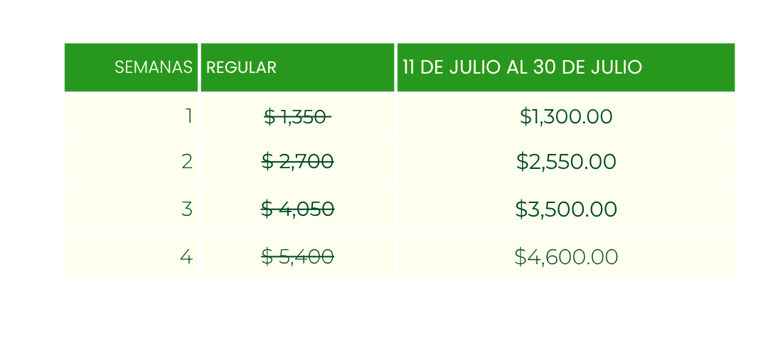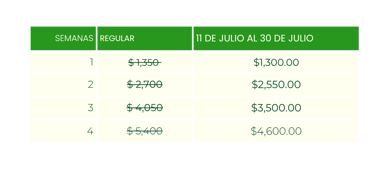 Llena el formulario especificando el número de participantes y semanas y te contactaremos vía WhatsApp para confirmarte el monto exacto a pagar, promociones activas y descuentos por hermanos o inscripción múltiple.